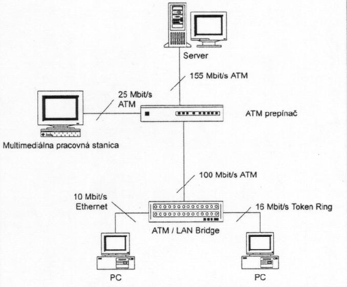 ATM (Asynchronous Transfer Mode) - technológia, ktorá umožňuje nielen prenos počítačových dát, ale aj hlasu, faxov, videa a iných izochrónnych informácií (typ informácie, kde je nutné zachovať presné časové intervaly medzi jednotlivými vzorkami, napr. digitalizovaný hlas) pri zachovaní jednotného spôsobu komunikácie od lokálnych spojení ku globálnym. Nevyhnutná je široká škála prenosových rýchlostí, pretože každý druh komunikácie vyžaduje rozličnú úroveň prenosovej kapacity. Prenosové rýchlosti sa pohybujú až do tisícov megabitov za sekundu. Pripojenie do globálnej siete ATM zatiaľ nie je možné, nič však nebráni použitiu siete ATM vnútri organizácie s perspektívou neskoršieho pripojenia ku globálnej sieti ATM. Ak použijeme ATM ako centrálnu sieť v organizácii, môžeme s výhodou použiť jej vysokú prenosovú rýchlosť. Relatívne jednoduché je pripojiť už existujúce siete LAN pomocou tzv. ATM/LAN Bridge. Výhodné je použitie ATM na pripojenie multimediálnych pracovných staníc, kde je výhodou nielen vysoká prenosová rýchlosť, ale aj zabudovaná podpora prenosu multimediálnych informácií. Pri ATM nie je prenosová rýchlosť presne daná, možno ju voliť podľa používanej aplikácie. Voľba veľkosti prenosového pásma je možná práve tým, že medzi "účastníkmi" sa naviaže dočasne udržované "virtuálne spojenie", tak ako telefónny hovor medzi telefónnymi účastníkmi. Funkciu telefónnej ústredne plní ATM prepínač. ATM prepínače sú ťažiskovými zariadeniami ATM siete. ATM prichádza aj ku koncovým zariadeniam, vyrábajú sa sieťové adaptéry pre prenosovú rýchlosť 155 Mb/s pre najrôznejšie HW platformy serverov, pre pracovné stanice s rýchlosťou 25 Mb/s. · Prepínanie sietí - nahrádza smerovač - pakety posiela na porty podľa MAC (Media Access Control) adries v hlavičke druhej sieťovej vrstvy. Pôvodne lineárny reťazec čiastkových segmentov sa nahradí zapojením do hviezdy, v ktorej strede bude centrálny prepojovací prvok. Nevýhody smerovačov oproti prepínačom - náročné nastavovanie, pomalosť. Nevýhody prepínačov - menšia bezpečnosť (dáta sa spracovávajú v druhej vrstve, u smerovačov v tretej), nerozoznáva druhy protokolov.